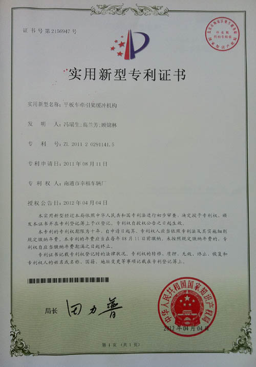 平板車牽引架緩沖機(jī)構(gòu)專利證書(shū)